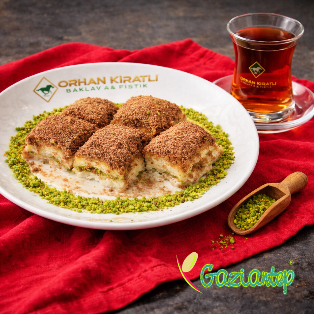 Geleneksel Gaziantep baklava ustalığı ile hazırlanan Soğuk Baklava, incecik açılmış çıtır baklava katları arasına yerleştirilen bol Antep fıstığı ve özel sütlü şerbeti ile benzersiz bir lezzet sunar. Fırından çıkan sıcak baklava, özel hazırlanan sütlü şerbet ile buluşturularak yumuşak ve kremamsı bir doku kazanır. Üzerine serpilen kakao ve fıstık dokunuşu ise bu eşsiz lezzeti zirveye taşır.